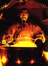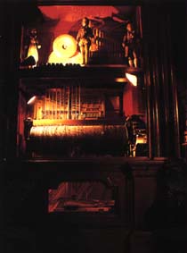 広い部屋の片面占拠して設置されている オート演奏機のまん中に陣取るオヤジ これ、ここの演奏機械の中でも最大級のヤツの一つ 名前は「MIKADO」(トークン2個で演奏) とてつもなく・・・アヤシイ 周りは金ピカの観音サマとか中国の宦官風のオヤジとかが 金色の扇をパタパタさせてたりして なんじゃそら? ちなみにこのヒゲオヤジが「MIKADO」らしい まん中の天蓋の中で偉そうにタイコを叩いたりする ミカドは太鼓は叩きません! 後から気づいたけどオペラのMIKADOのつもりなのかな??